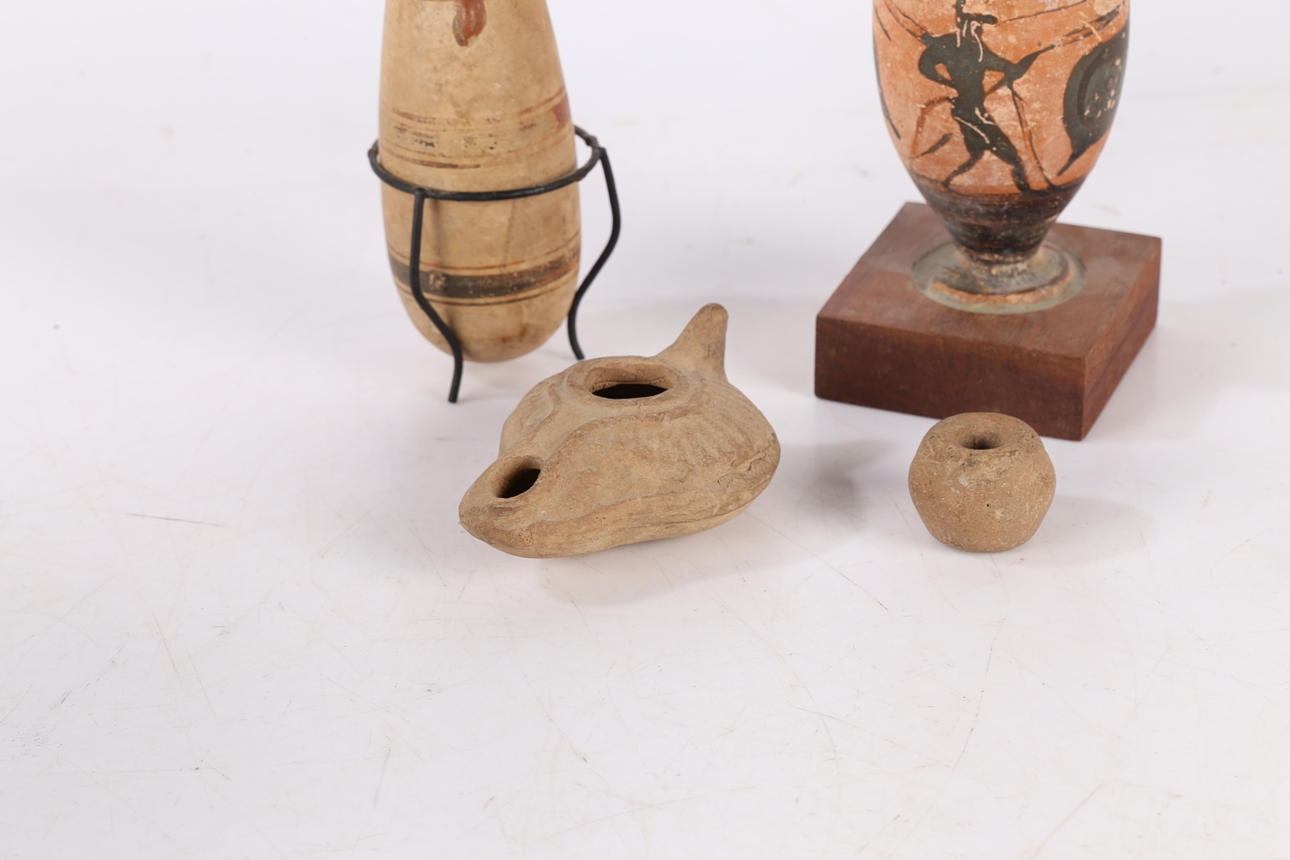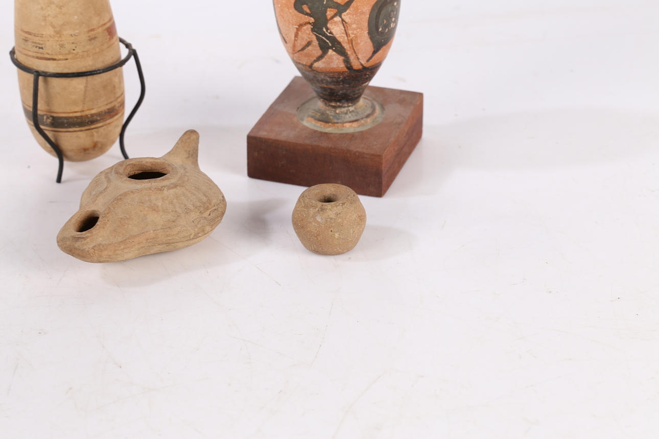 För att inkludera två grekiska vaser 11 cm höga och 12 cm höga, en oljelampa från romersk tid och en lerpärla, (4)