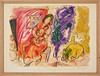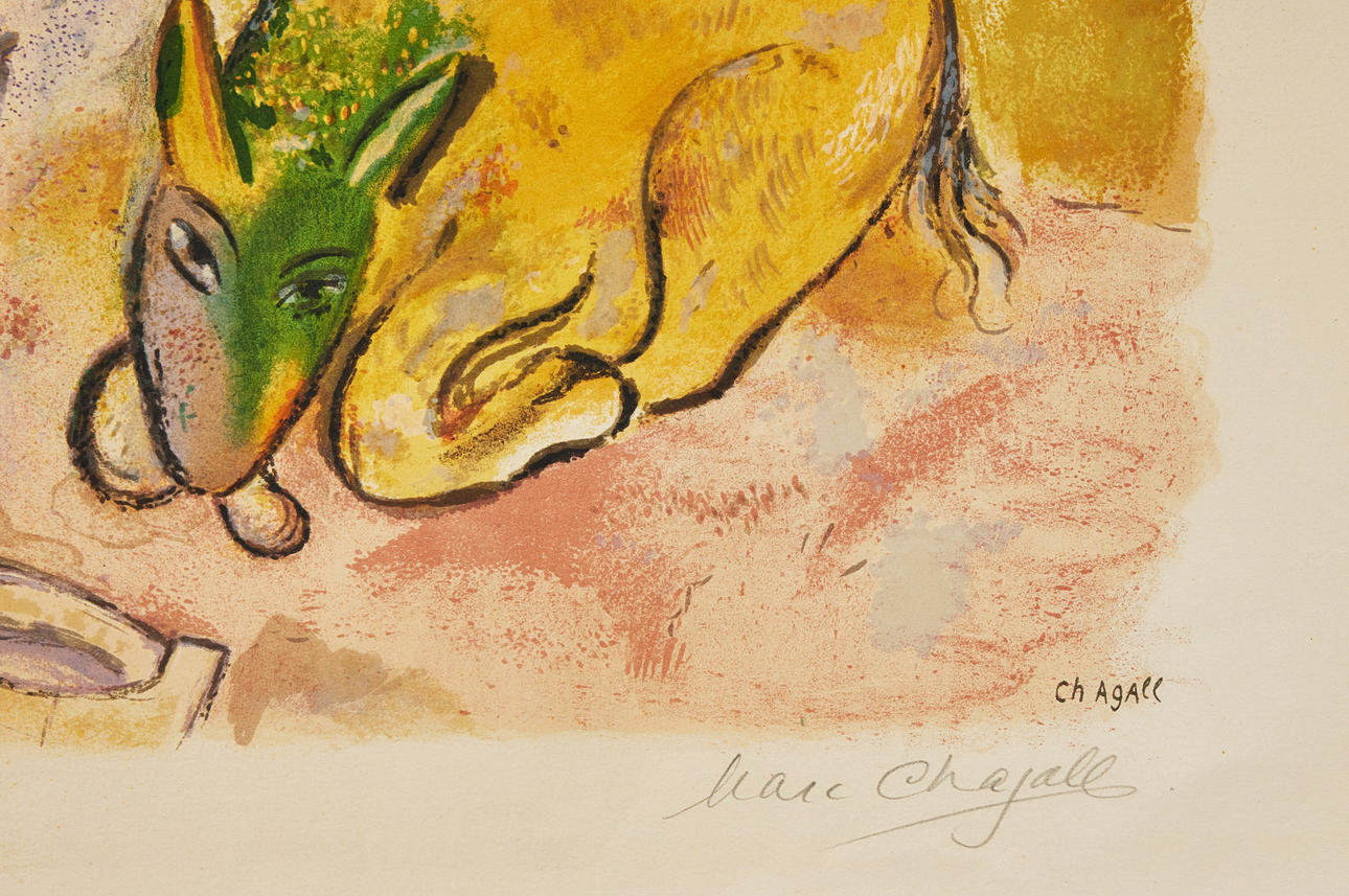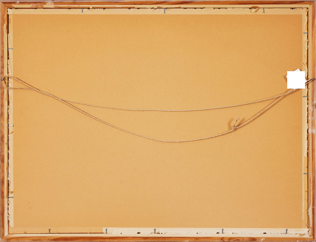 Pale time staining, discolouring alongside edges of sheet (from frame). Minor handling creases. A small crease to upper left corner. Creases to lower edge/margin of sheet (just below the signature). The lower deckled edge with small defects. Left and right edges possibly slightly trimmed. Colours attenuated.
