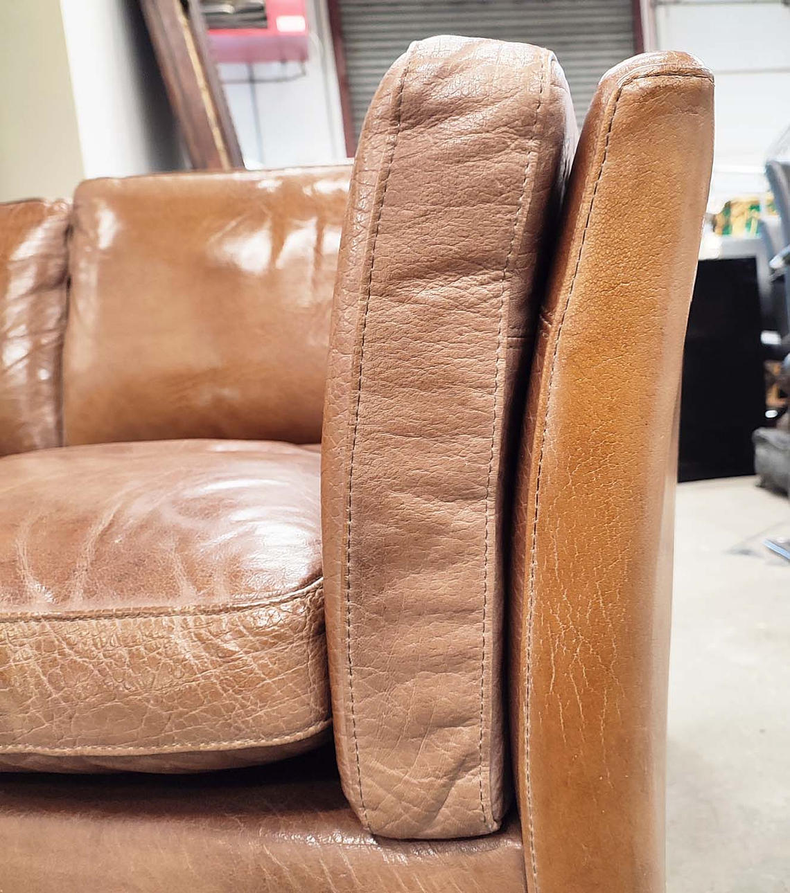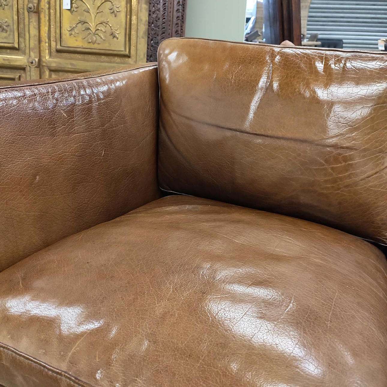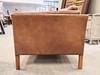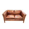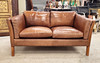 Dansk i solbrunt läder, 75cm H x 146cm B x 80cm D.