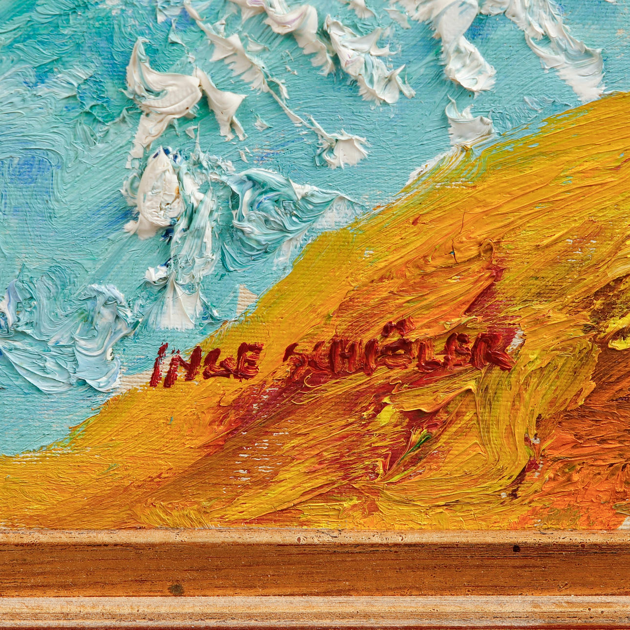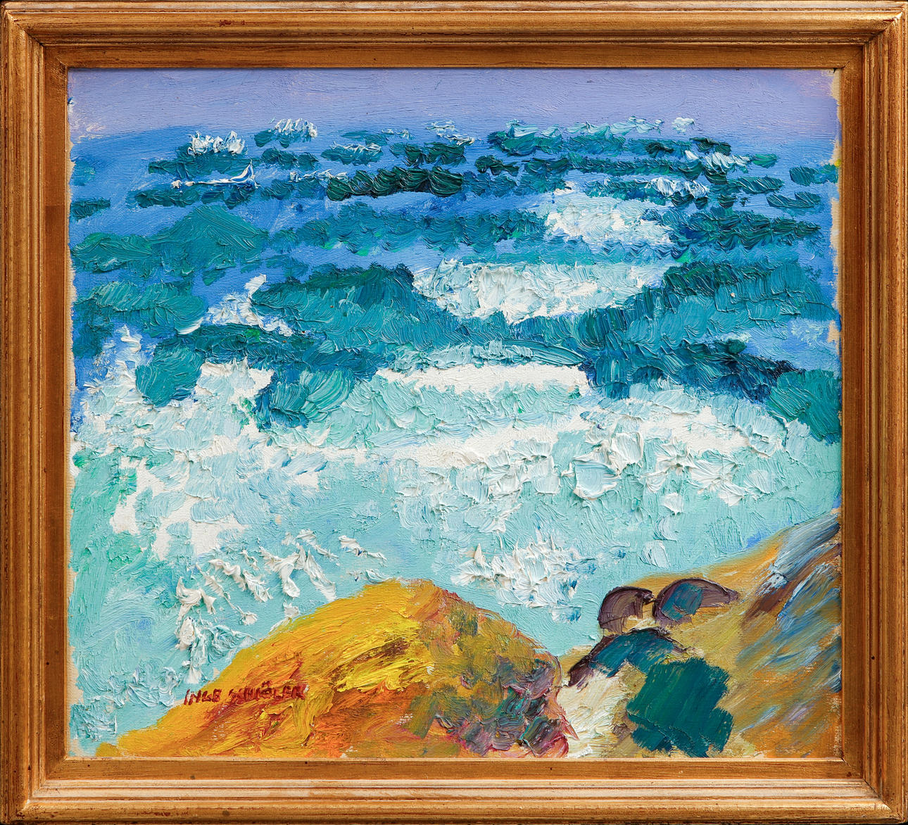 Signerad Inge Schiöler. Bildyta 42 x 47 cm. Rammått 50 x 54 cm.
