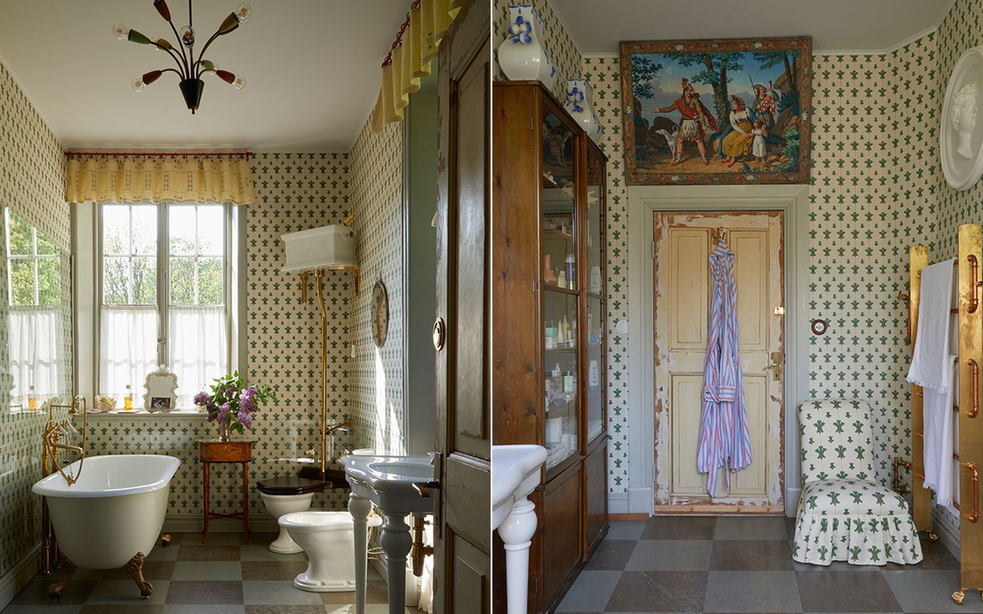 Det blommönstrade skåpet passade perfekt in i huset i Skåne, bordsdukar som Beata Heuman återanvänt och gjort om till charmiga gardinlampetter, en ovanligt hög men ganska grund bokhylla som nu står i badrummet, Taito taklampa designad av Paavo Tynell är en av Beatas senaste fynd, och ett bordsspegel som nu pryder badrummet.