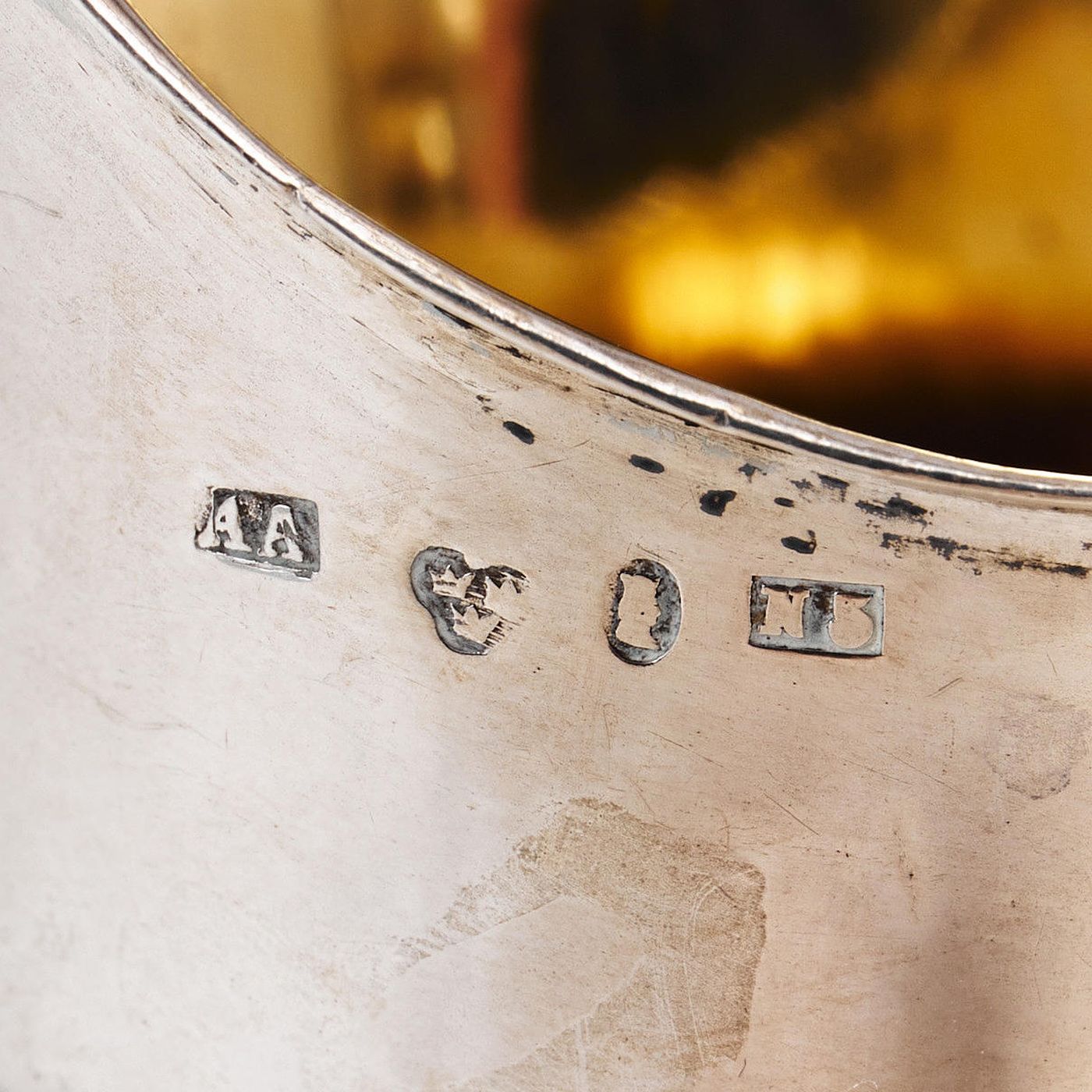 Årsstämpel, silverhaltstämpel, mästarstämpel, stadsstämpel, kontrollstämpel, trekronorstämpel (kattfoten) samt importstämplar.