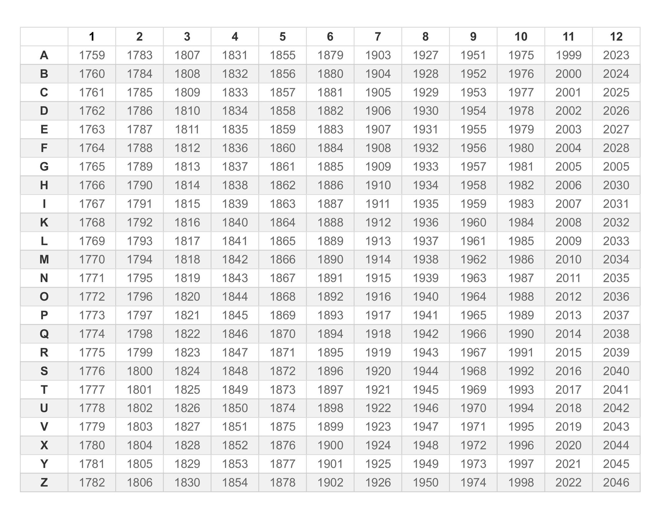 Årsbokstaven är en bokstav i kombination med en siffra som visar tillverkningsåret. Detta berättar helt enkelt vilket år som föremålet är tillverkat. D8 betyder till exempel 1930. Årsbokstäverna är samma för både silver, guld, platina och även tenn.