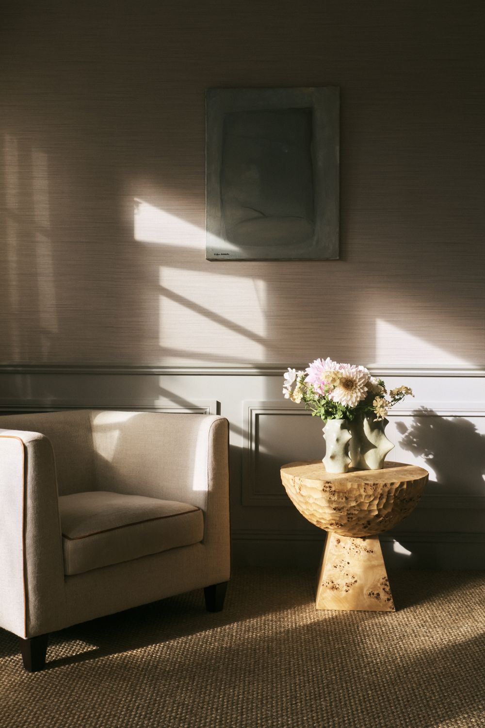 Fåtöljen, ett auktionsfynd, har klätts om i tyg från Dedar. Sidobordet kommer från Louises eget varumärke Veermakers och keramiken är av Knud Basse – även den köpt på auktion.