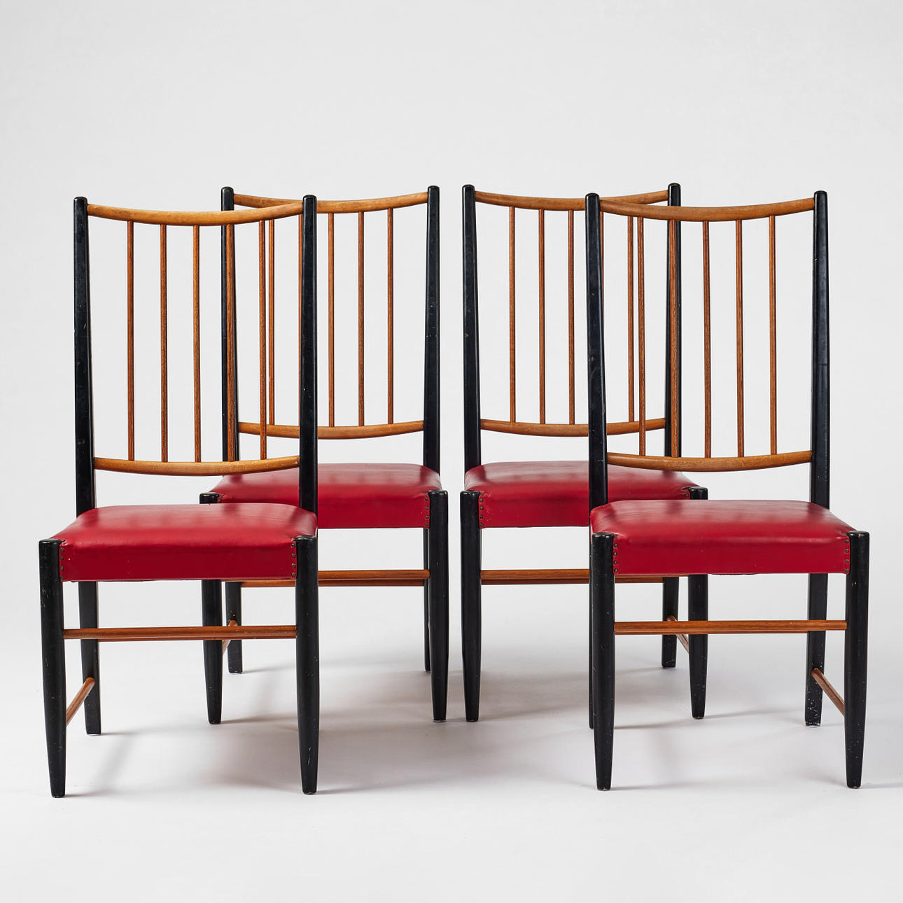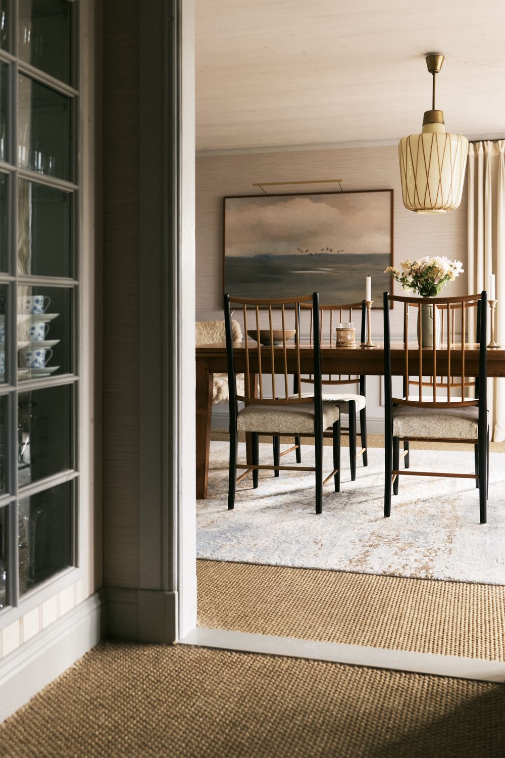 Runt mahognymbordet står stolar av Karl-Axel Adolfsson, köpta på auktion och omklädda av Louise. Handknuten matta och gardiner i tyg från Dedar.