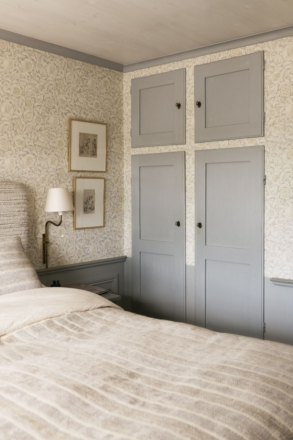 Sänggaveln är klädd i tyg från Christopher Farr. Kudden och överkastet är i textilier från C&C Milano. På väggen hänger teckningar av Fritz von Dardel – en släkting till Louise.