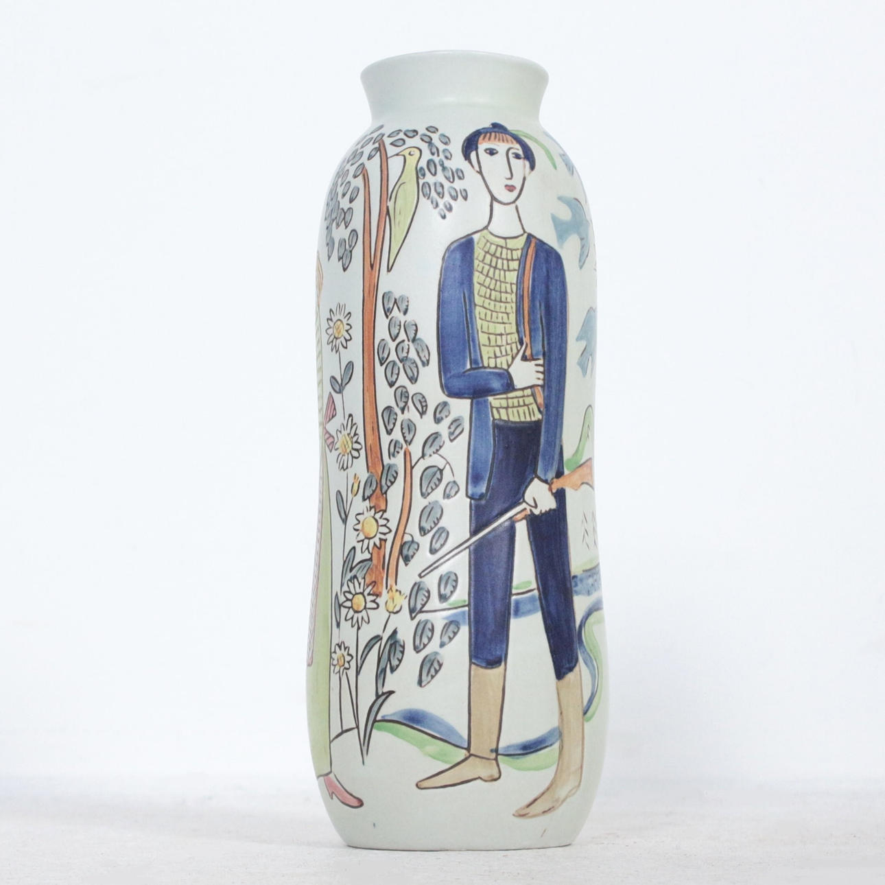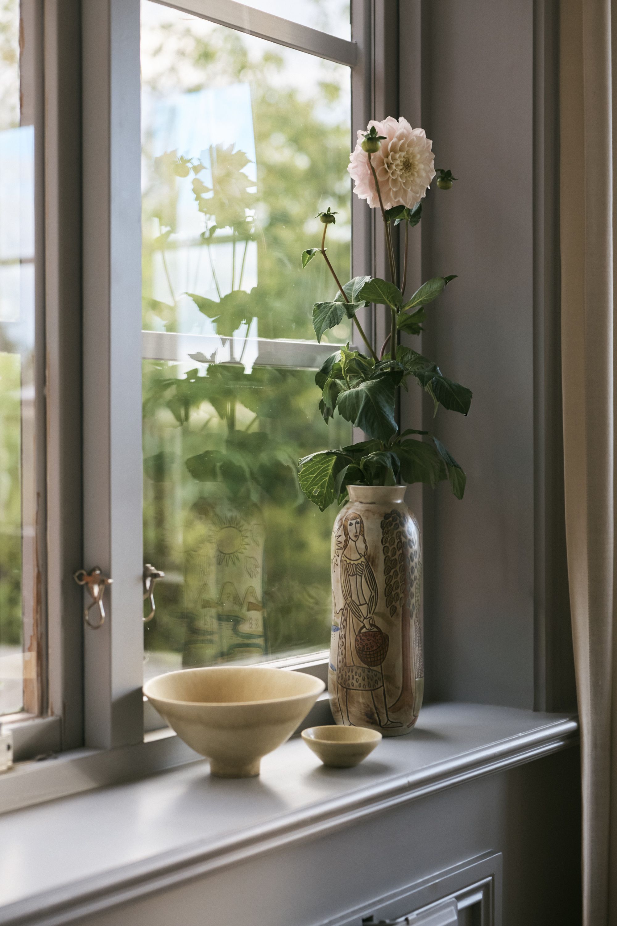 I fönstret står fler auktionsfynd uppradade. En vas av Carl-Harry Stålhane för Rörstrand och keramikskålar av Berndt Friberg.