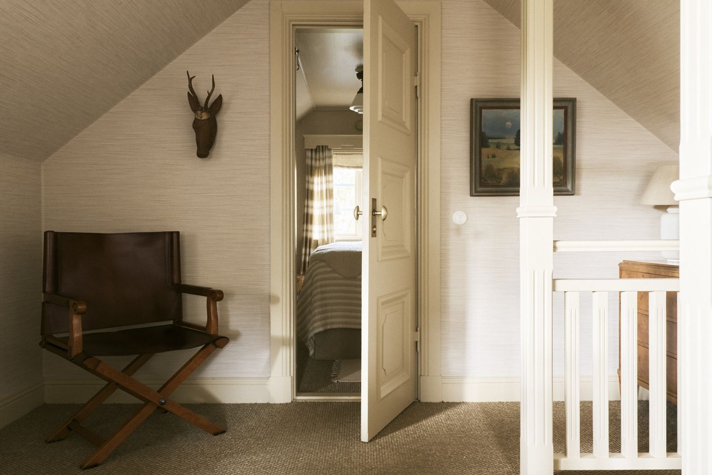 Läderfåtölj av Grange. Det snidade hjorthuvudet i trä (med äkta horn) köptes på auktion och har följt familjen genom flera hem. Målningen till höger hängde en gång i Louises barndomshem. Alla textilier i sovrummet kommer från C&C Milano.