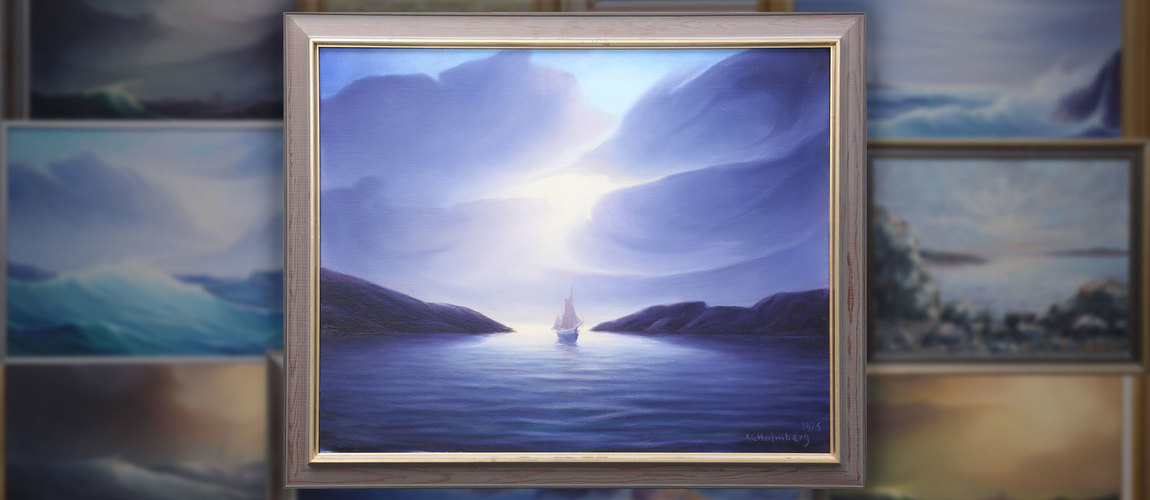 Havet och himlen som uttryck för något större. I KG Holmbergs måleri får de kustnära vyerna något nästan övernaturligt över sig. Ett vibrerande ljus med släktskap till barockens religiöst hållna måleri eller kanske till 1900-talets mer magiskt hållna surrealism. Det är i de rymderna vi finner KG Holmberg. Någon har sagt att han verkade i Marcus Larsons anda i vilken han tillförde en dramatik, ibland ett bedrägligt lugn eller en spänning i sitt skildrande av de miljöer där himlen möter hav. Någon gång en ensam båt stävandes fram men för det mesta bara vågor och moln i samspel med varandra.