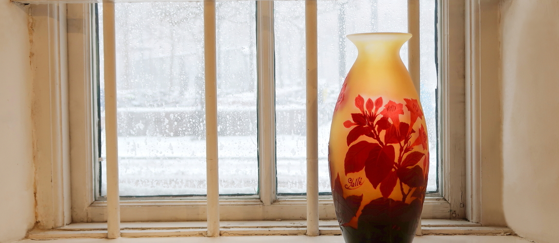 När man får det förra sekelskiftet förevisat för sig genom gamla journalfilmer så tycks den tidens människor i hög hastighet ha rört sig i en värld av gråskala. De rusar omkring framför kameraögats objektiv i en svartvit värld. Men montrarna hos Crafoord Auktioner i Lund berättar en annan historia. Där kommer det som brukar kallas regnbågens alla färger vällande mot en. Som i vaserna från Daumes Frères där toner i orange mjukt övergår i gröna nyanser som ibland drar åt det gula hållet. Eller som i den förtjusande lilla rosa Gallé-vasen med sina rödlila överfångsblommor är ett stilleben i sig. Och vad ska man säga om den 25 cm höga vasen av Gabriel Argy-Rousseau? Ett synnerligen säreget stycke konsthantverk tillkommet i en tid då glaset gick i bräschen för ett samhälle i omvandling.