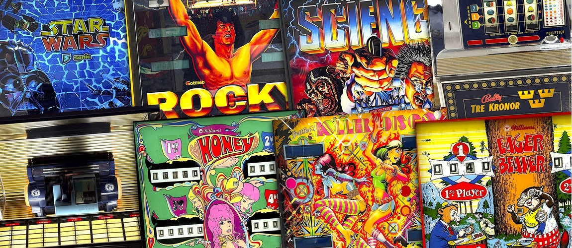 Här bjuds ni på tre decennier av flipperspel, inklusive några riktiga tungviktare. Som det galaktiskt blåa Star Wars från 1987 och det fem år äldre knockoutiga Rocky. Kanske ska man säga fyra decennier, för det finns lite godis här också från 50-talet. För finsmakarna alltså. Och tröttnar man så kan man ju alltid lägga på nåt bra i ljudväg i jukeboxen, spela en mekanisk match fotboll eller ge de där enarmade banditerna en omgång. Ett par radiobilar kompletterar alltihop. Bara för den där riktigt äkta känslan alltså.